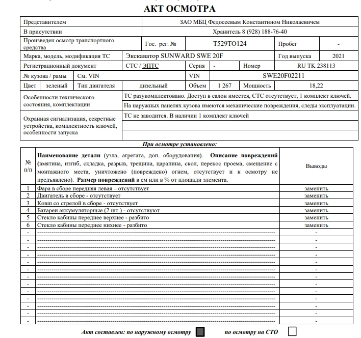 Наименование Экскаватор SUNWARD SWE 20F Марка Sunward Модель Swe20f Год выпуска 2021 Идентификационный номер (VIN) Swe20f02211 Местонахождение Ростовская область, г. Ростов-на Дону, Октябрьский р-н, СТ «Весна» 47 Цвет кузова Зеленый Рабочий объем двигателя куб. см 1 267 Технически допустимая максимальная масса 1 940 Изготовитель ТС (страна) SUNWARD INTELLIGENT equipmentco., LTD, КИТАЙ