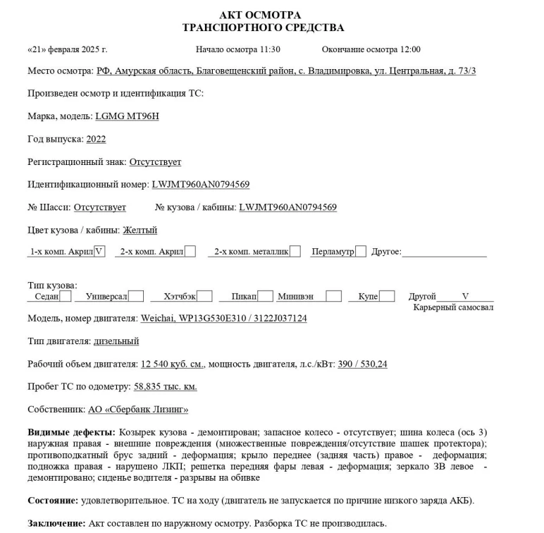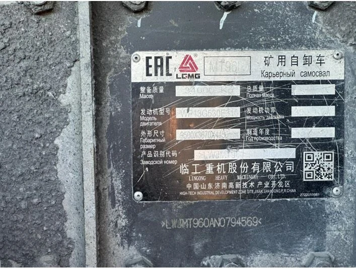 Карьерный самосвал Марка, модель ТС LGMG MT96H Идентификационный номер LWJMT960AN0794569 Категория ТС Категория D Год выпуска ТС 2022 Модель / № двигателя Weichai, WP13G530E310 / 3122J037124 Кузов (кабина) № LWJMT960AN0794569 Цвет кузова (кабины) Желтый Мощность двигателя, кВт / л.с. 390 / 530,24 Рабочий объем двигателя, куб.см 12 540 Тип двигателя Дизельный Экологический класс Третий Разрешенная максимальная масса, кг 99 000 Масса без нагрузки, кг 34 000 Тип КПП Гидромеханическая, с автоматическим управлением Комплектация/ модификация Организация-изготовитель ТС Lingong Heavy Machinery Co., Ltd. Страна изготовителя Китай Собственник объекта Акционерное общество "Сбербанк Лизинг" (АО "Сбербанк Лизинг")