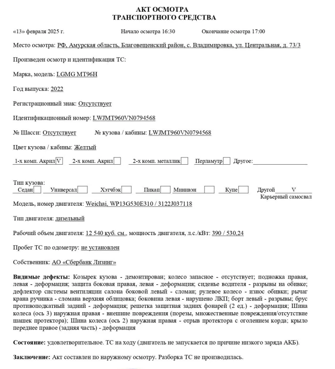 Карьерный самосвал Марка, модель ТС LGMG MT96H Идентификационный номер LWJMT960VN0794568 Категория ТС Категория D Год выпуска ТС 2022 Модель / № двигателя Weichai, WP13G530E310 / 3122J037118 Кузов (кабина) № LWJMT960VN0794568 Цвет кузова (кабины) Желтый Мощность двигателя, кВт / л.с. 390 / 530,24 Рабочий объем двигателя, куб.см 12 540 Тип двигателя Дизельный Экологический класс Третий Разрешенная максимальная масса, кг 99 000 Масса без нагрузки, кг 34 000 Тип КПП Гидромеханическая, с автоматическим управлением Организация-изготовитель ТС Lingong Heavy Machinery Co., Ltd. Собственник объекта Акционерное общество "Сбербанк Лизинг" (АО "Сбербанк Лизинг")