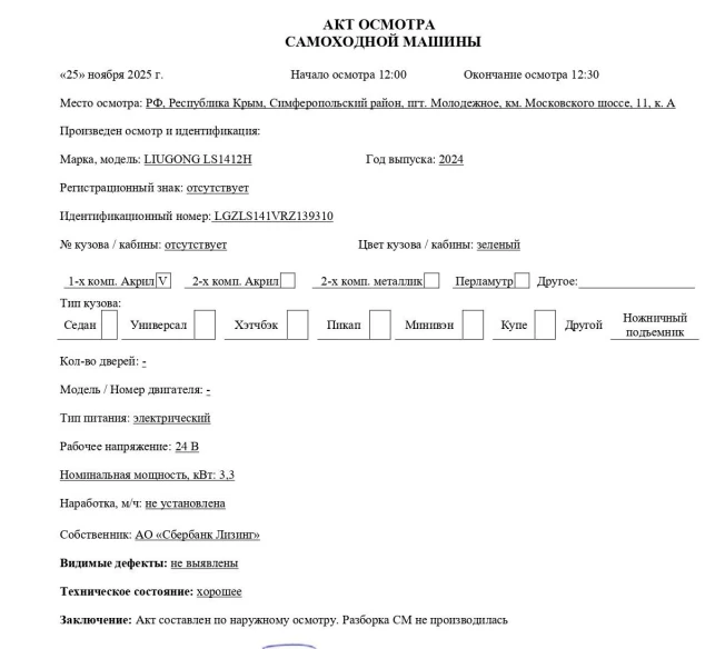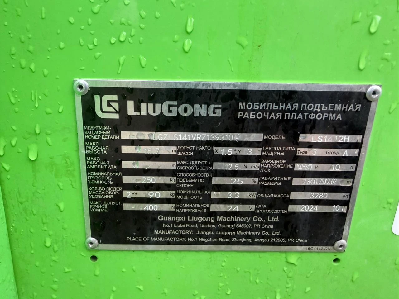 Наименование (тип) Мобильная подъемная рабочая платформа Марка, модель LIUGONG LS1412H Идентификационный номер LGZLS141VRZ139310 Год выпуска 2024 Номинальная мощность, кВт 3,3 Основные технические характеристики Тип питания - электрический; рабочая высота, м -15,70, высота подъема платформы (внутри/снаружи), м - 13,70; грузоподъемность, кг - 250.
