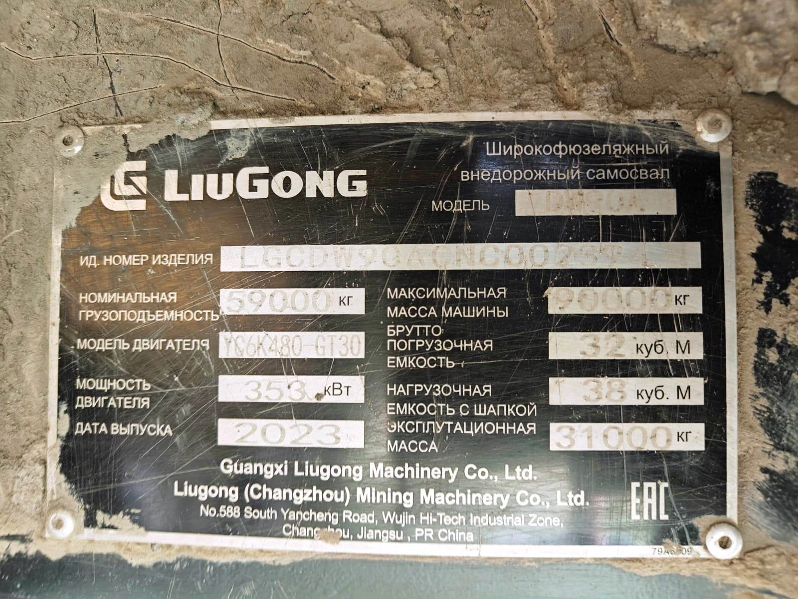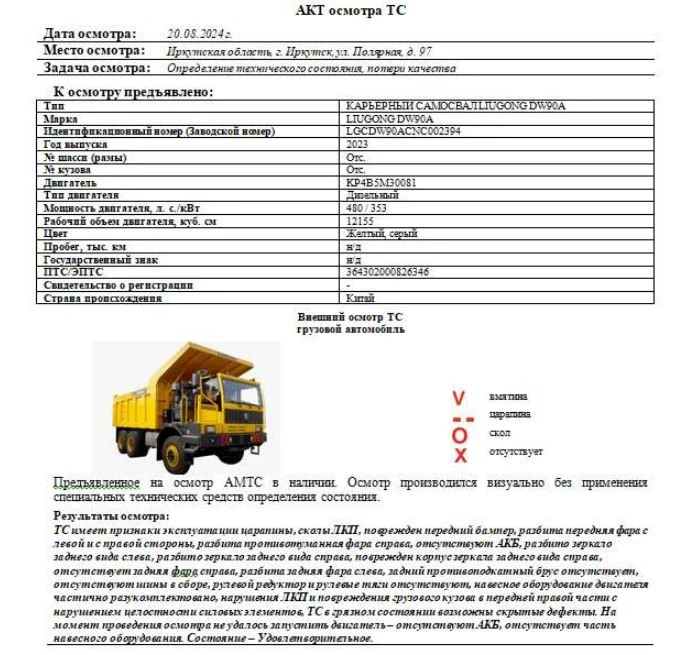 КАРЬЕРНЫЙ САМОСВАЛ LIUGONG DW90A Зав. № машины (VIN) LGCDW90ACNC002394 Марка, модель LIUGONG DW90A Тип ТС Грузовой Год вып. 2023 Двигатель KP4B5M30081 Шасси Отс. Кузов (кабина, прицеп) Отс. Цвет Желтый, серый Мощность двигателя, л.с. 480 Объем двиг., см3 12155 Тип дв. Дизельный Тип кузова Грузовой КПП Механическая Экологический клаасс 3 Разрешенная максимальная масса, кг 90000 Масса без нагрузки, кг 31000 Грузоподъемность, т. 59000 Страна-производитель Китай