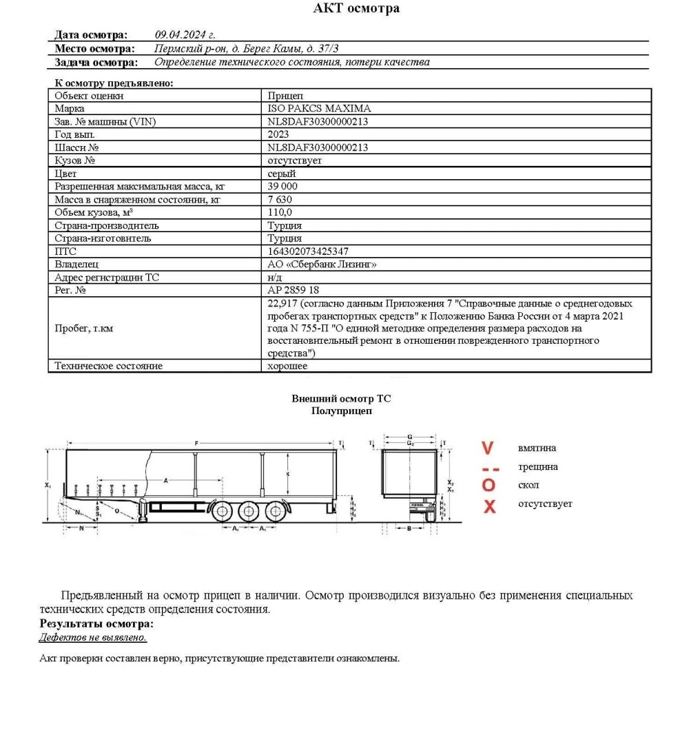 Объект оценки Прицеп Марка ISO PAKCS MAXIMA Зав. № машины (VIN) NL8DAF30300000213 Год вып. 2023 Шасси № NL8DAF30300000213 Кузов № отсутствует Цвет серый Разрешенная максимальная масса, кг 39 000 Масса в снаряженном состоянии, кг 7 630 Объем кузова, м³ 110,0 Страна-производитель Турция Страна-изготовитель Турция