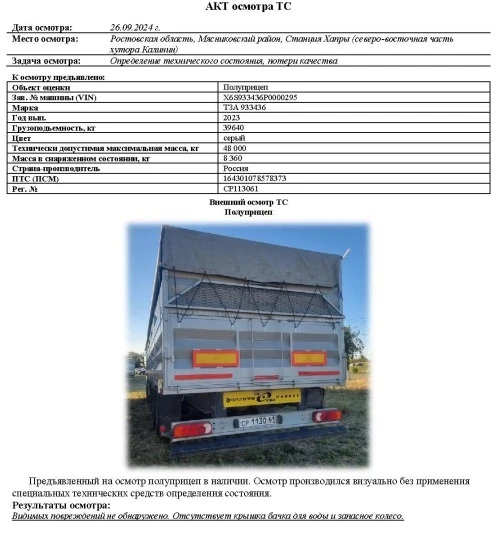 Полуприцеп Зав. № машины (VIN) X6S933436P0000295 Марка ТЗА 933436 Год вып. 2023 Грузоподъемность, кг 39640 Пробег, тыс. км. 50,041* Цвет серый Технически допустимая максимальная масса, кг 48 000 Масса в снаряженном состоянии, кг 8 360 Страна-производитель Россия ПТС (ПСМ) 164301078578373 Владелец АО «Сбербанк Лизинг» Рег. № СР113061