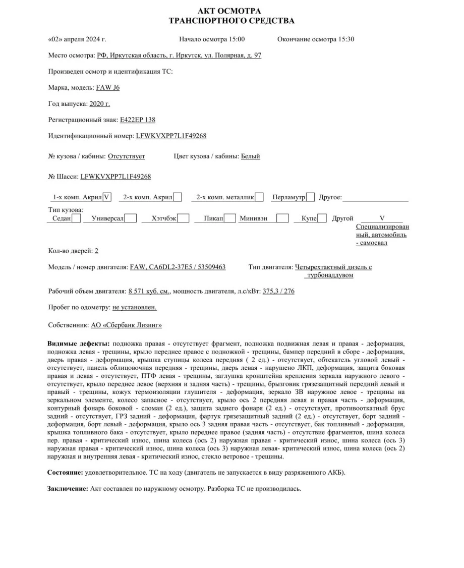 подножка правая - отсутствует фрагмент, подножка подвижная левая и правая - деформация, подножка левая - трещины, крыло переднее правое с подножкой - трещины, бампер передний в сборе - деформация, дверь правая - деформация, крышка ступицы колеса передняя ( 2 ед.) - отсутствует, обтекатель угловой левый - отсутствует, панель облицовочная передняя - трещины, дверь левая - нарушено ЛКП, деформация, защита боковая правая и левая - отсутствует, ПТФ левая - трещины, заглушка кронштейна крепления зеркала наружного левого - отсутствует, крыло переднее левое (верхняя и задняя часть) - трещины, брызговик грязезащитный передний левый и правый - трещины, кожух термоизоляции глушителя - деформация