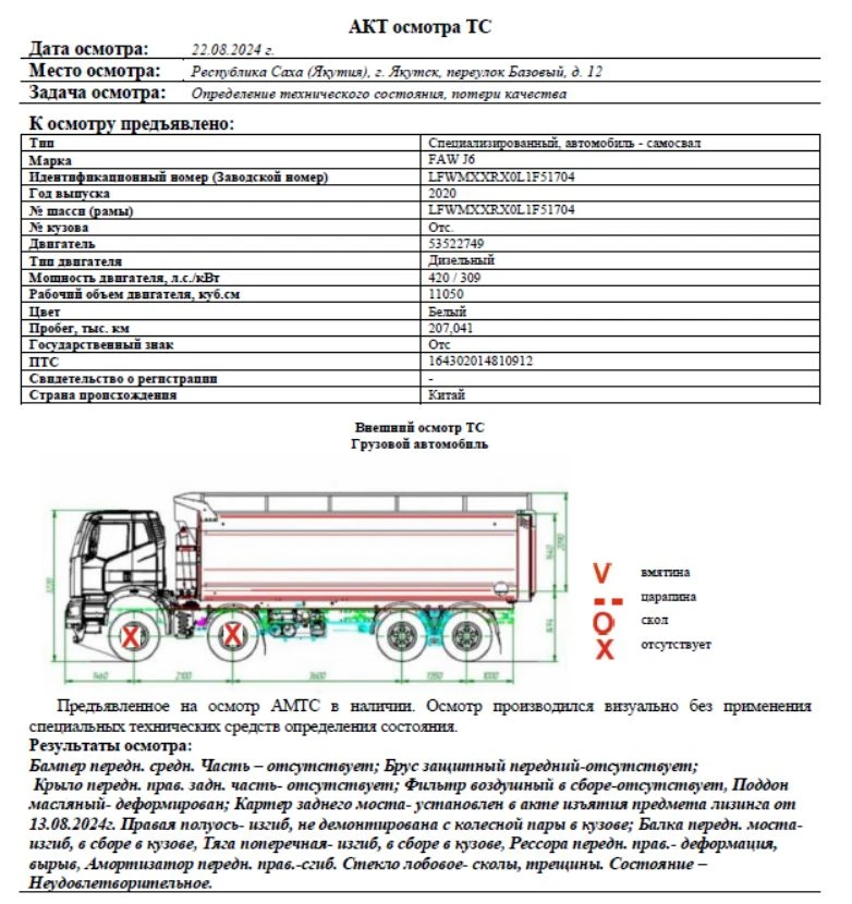 Специализированный, автомобиль - самосвал Зав. № машины (VIN) LFWMXXRX0L1F51704 Марка, модель FAW J6 Тип ТС Грузовой Год вып. 2020 Двигатель 53522749 Шасси LFWMXXRX0L1F51704 Кузов (кабина, прицеп) Отс. Цвет Белый Мощность двигателя, л.с. 420 Объем двиг., см3 11050 Тип дв. Дизельный Тип кузова Грузовой КПП МКПП Экологический клаасс 5 Разрешенная максимальная масса, кг 42600 Масса без нагрузки, кг 19020 Грузоподъемность, т. 23580