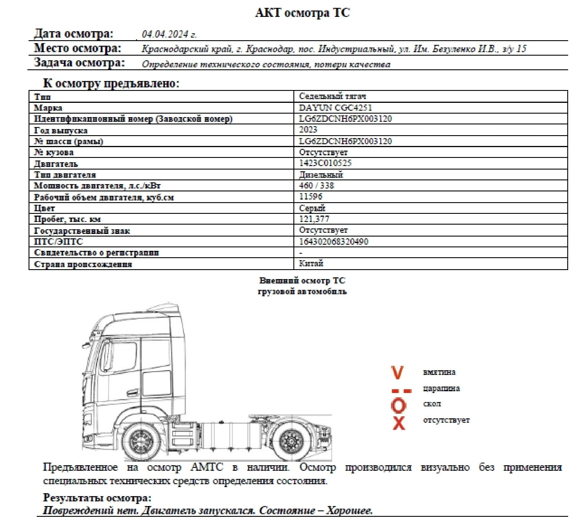 Повреждений нет. Двигатель запускался. Состояние - хорошее.