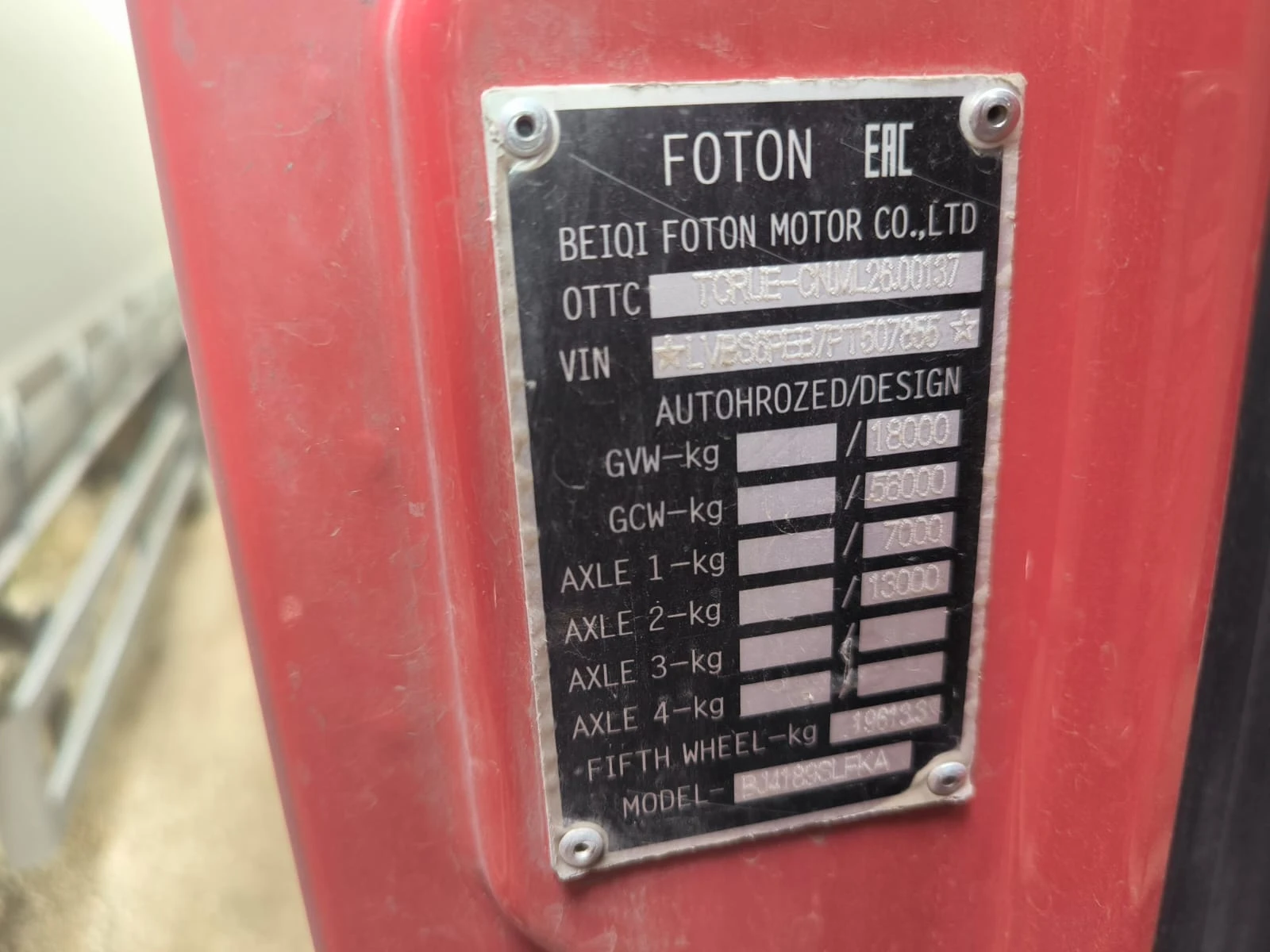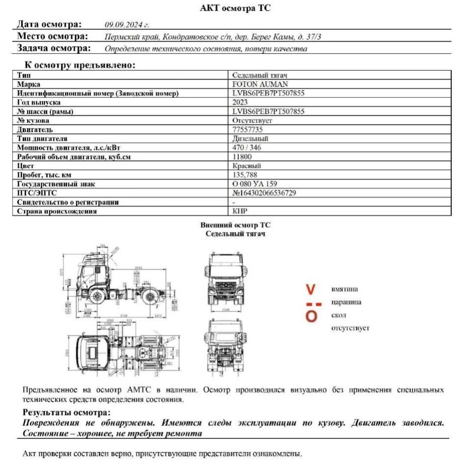 Седельный тягач Зав. № машины (VIN) LVBS6PEB7PT507855 Марка, модель FOTON AUMAN Тип ТС Седельный тягач Год вып. 2023 Двигатель 77557735 Шасси LVBS6PEB7PT507855 Кузов (кабина, прицеп) Отс. Цвет Красный Мощность двигателя, л.с. 470 Объем двиг., см3 11800 Тип дв. Дизельный, четырехтактный, с воспламенением от сжатия, с турбонаддувом Тип кузова Тягач седельный КПП АКПП Экологический клаасс 5 Разрешенная максимальная масса, кг 18000 Масса без нагрузки, кг 8040 Грузоподъемность, кг. 9960 Страна-производитель КНР Страна-изготовитель КНР ПТС №164302066536729 Комплектация Базовая Владелец АО «Сбербанк Лизинг» Адрес регистрации ТС - Рег. № О 080 УА 159 Пробег, тыс. км 135,788