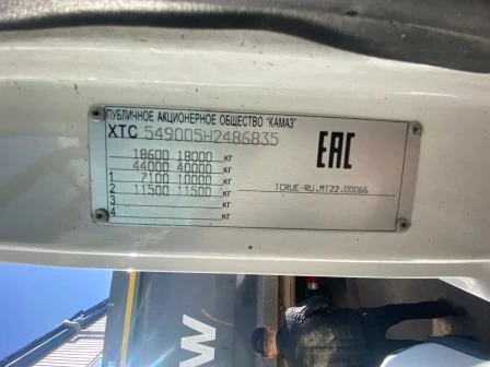 Наименование (тип ТС) Седельный тягач Марка, модель ТС КАМАЗ 5490-S5 Идентификационный номер VIN XTC549005H2486835 Категория ТС Категория C Год выпуска ТС 2017 Дата выпуска, принятая к расчёту 23.12.2017 Модель / № двигателя OM457LA, V/3 0346466 Шасси № XTC549005H2486835 Кузов (кабина) № 549000H0009786 Цвет кузова (кабины) Белый RAL 9010 Мощность двигателя, л.с./кВт 401 / 295 Рабочий объем двигателя, куб.см 11 967 Тип двигателя Дизель Экологический класс Пятый Разрешенная максимальная масса, кг 18 600 Масса без нагрузки, кг 7 900 Тип КПП Механическая, с ручным управлением Комплектация/ модификация Колёсная формула 4х2/задний привод. Трансмиссия механическая, с ручным управлением. Кабина 2-х местная, с 1-м спальным местом. (Подробнее см. в Приложении №1 к Договору купли-продажи № ОВ/Ф-158880-09-01-С-01 от 22.09.2022 г., представлено в Приложении №2 отчета) Организация-изготовитель ТС ПАО "КАМАЗ" Страна изготовителя Россия Паспорт транспортного средства/Выписка из электронного паспорта транспортного средства № 16 OC 918888 от 23.12.2017 г. Свидетельство о регистрации ТС Не предоставлено Регистрационный знак К442АА 702