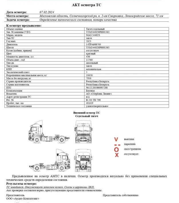 Тягач седельный МАЗ 544028 Зав. № машины (VIN) Y3M544028P0001365 Марка, модель МАЗ 544028 Тип ТС тягач Год вып. 2023 Двигатель 14TPA000763 Шасси Y3M544028P0001365 Кузов (кабина, прицеп) отсутствует Цвет красный Мощность двигателя, л.с. 430 Объем двиг., см3 11760 Тип дв. дизельный Тип кузова тягач КПП механическая Экологический класс 5 Разрешенная максимальная масса, кг 18450 Пробег, тыс. км 48,619
