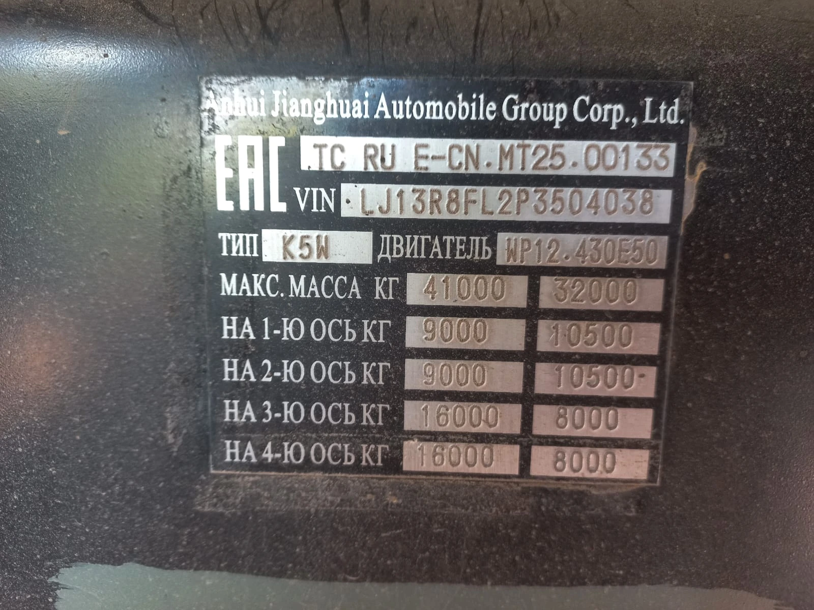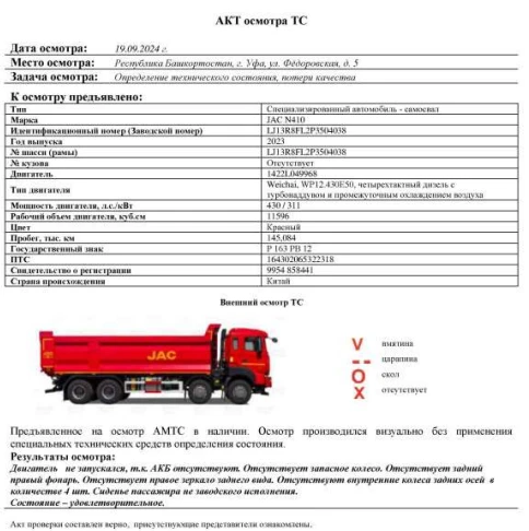 Специализированный автомобиль - самосвал Зав. № машины (VIN) LJ13R8FL2P3504038 Марка, модель JAC N410 Тип ТС Грузовой Год вып. 2023 Двигатель 1422L049968 Шасси LJ13R8FL2P3504038 Кузов (кабина, прицеп) Отсутствует Цвет Красный Мощность двигателя, л.с. 430 Объем двиг., см3 11596 Тип дв. Weichai, WP12.430E50, четырехтактный дизель с турбонаддувом и промежуточным охлаждением воздуха Тип кузова Самосвал КПП Механическая, с ручным управлением Экологический класс Пятый Разрешенная максимальная масса, кг 41000 Масса без нагрузки, кг 19000 Грузоподъемность, кг. 22000 Страна-производитель Китай Страна-изготовитель Китай ПТС 164302065322318 Владелец АО «Сбербанк Лизинг» Адрес регистрации ТС - Рег. № Р 163 РВ 12 Пробег, тыс.км 145,084