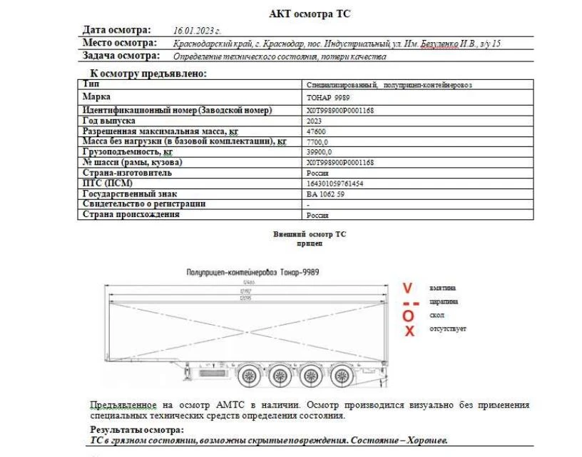 Специализированный, полуприцеп-контейнеровоз Марка ТОНАР 9989 Зав. № машины (VIN) X0T998900P0001168 Год вып. 2023 № шасси (рамы) X0T998900P0001168 Цвет Красный Разрешенная максимальная масса, кг 47 600 Масса без нагрузки (в базовой комплектации), кг 7 700 Грузоподъемность, кг 39 900 Страна-производитель Россия Страна-изготовитель Россия ПТС (ПСМ) 164301059761454