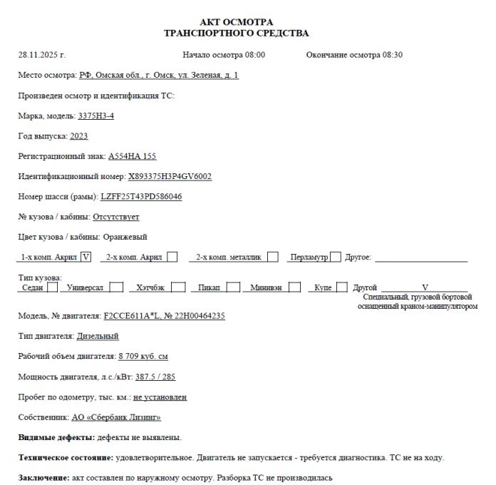 Специальный, грузовой бортовой оснащенный краном-манипулятором Марка, модель ТС 3375H3-4 Идентификационный номер VIN X893375H3P4GV6002 Категория ТС С Год выпуска ТС 2023 Модель / № двигателя F2CCE611A*L, № 22H00464235 Шасси № LZFF25T43PD586046 Кузов (кабина) № Отсутствует Цвет кузова (кабины) Оранжевый Мощность двигателя, л.с./кВт 387.5 / 285 Рабочий объем двигателя, куб.см 8 709 Тип двигателя Дизельный Экологический класс Пятый Разрешенная максимальная масса, кг 33 500 Масса без нагрузки, кг 14 750 Тип КПП МКПП Комплектация/ модификация Модификация 3375H3-4. Марка базового ТС (шасси) - HONGYAN. Колёсная формула 6х4, кабина 2-х местная с 1-м спальным местом. КМУ NAGANO CMI 8S 4A Организация-изготовитель ТС Общество с ограниченной ответственностью «АВТОФЛАГМАН» Страна изготовителя РФ Собственник объекта Акционерное общество "Сбербанк Лизинг" (АО "Сбербанк Лизинг")