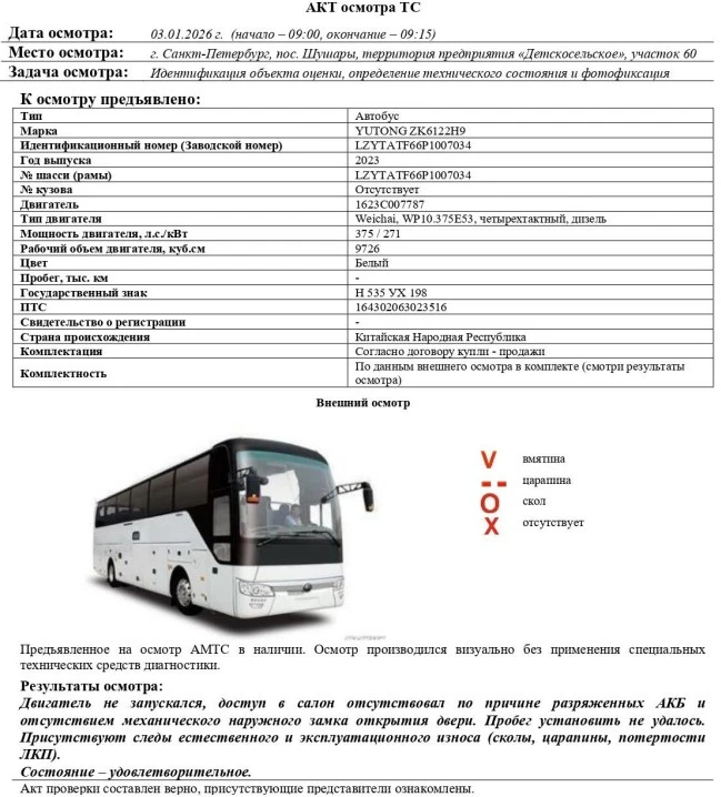 Автобус Зав. № машины (VIN) LZYTATF66P1007034 Марка, модель YUTONG ZK6122H9 Тип ТС Автобус Год вып. 2023 Двигатель 1623C007787 Шасси LZYTATF66P1007034 Кузов (кабина, прицеп) Отсутствует Цвет Белый Мощность двигателя, л.с. 375 Объем двиг., см3 9726 Тип дв. Weichai, WP10.375E53, четырехтактный, дизель Тип кузова Автобус КПП Механическая, с ручным управлением Экологический класс Пятый Разрешенная максимальная масса, кг 19300 Масса без нагрузки, кг 14800 Количество мест для сидения 55 (1 место водителя, 1 место члена экипажа, 53 места для пассаж) Пассажировместимость 53 Грузоподъемность, кг 4 500 Страна-производитель Китайская Народная Республика Страна-изготовитель Китайская Народная Республика Комплектация Согласно договору купли - продажи Комплектность По данным внешнего осмотра в комплекте (смотри результаты осмотра) ПТС 164302063023516 Владелец АО «Сбербанк Лизинг» Адрес регистрации ТС - Рег. № Н 535 УХ 198 Пробег, тыс.км 175,745 (по данным акта изъятия)