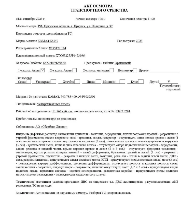 Радиатор охлаждения двигателя- вмятины, деформация, щиток подножки правый- разрушение с утратой фрагментов, стекло ветрового окна- трещины, сколы, генератор- отсутствует, шина колеса правая и левая (1 ось), шина колеса правая и левая внутренняя и наружняя (2 ось), шина колеса правая и левая внутренняя и наружняя (3 ось)- критический износ, шина и диск запасного колеса- отсутствует, опора подвески кабины задняя- деформация, следы ремонта в нижней части, крыло верхнее правое и левое (2 и 3 ось)- отсутствует, форсунка топливная- отсутствует, щиток розетки прицепа нижний- изгиб, деформация, брызговик правый и левый (1 ось)- разрывы с утратой фрагментов, глушитель- разрывы в нижней части, вмятины, рама а/м- изгиб в задней левой части, ДВС - снят, разукомплектован, присутствуют следы подтёков масла, КПП- присутствуют следы подтёков масла, мост (3 ось)- повреждения картера дифференциала, шестерни дифференциала, отсутствует полуось и крышка полуоси слева, салон кабины- загрязнен, аккумуляторы- разряжены, питание отсутствует, мост (1,2 и 3 ось)- присутствуют следы подтёков масла, тормозная система- имеется неисправность, раздаточная коробка- присутствуют следы подтёков масла, система охлаждения- охлаждающая жидкость отсутствует.