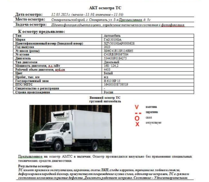 Объект оценки Автомобиль Зав. № машины (VIN) XZV3010GAP0000628 Марка, модель ГАЗ 3010GA Тип ТС Грузовой Год вып. 2023 Двигатель 534450P0184275 Шасси X96C41R13P1149865 Кузов (кабина, прицеп) C41RB3P0067584 Цвет Белый Мощность двигателя, л.с. 168 Объем двиг., см3 4433 Тип дв. Дизельный Тип кузова Грузовой КПП Механическая Экологический клаасс 3 Разрешенная максимальная масса, кг 8700 Масса без нагрузки, кг 4810 Грузоподъемность, т. 3890