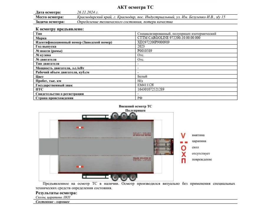 Специализированный, полуприцеп изотермический Зав. № (VIN) XD2972200P9000853 Марка, модель CTTM CARGOLINE 972200-10.00.00.000 Тип ТС Прицеп Год выпуска 2023 Двигатель Отс. Шасси P0010558 Кузов (кабина, прицеп) Отс. Цвет Белый Мощность двигателя, л.с. - Объем двигателя, см3 - Тип двигателя - Тип кузова - КПП - Экологический класс - Разрешенная максимальная масса, кг 38000 Масса без нагрузки, кг 8900
