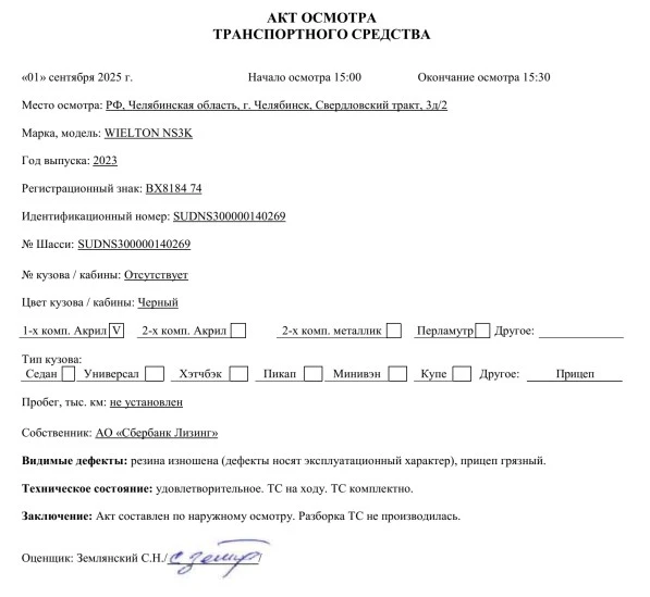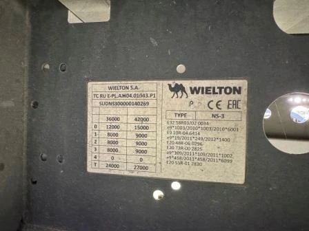 Наименование (тип ТС) Прицеп Марка, коммерческое наименование WIELTON NS3K Идентификационный номер SUDNS300000140269 Категория ТС Прицеп Год выпуска ТС 2023 Модель, № двигателя Отсутствует Шасси № SUDNS300000140269 Кузов (кабина) № Отсутствует Цвет кузова (кабины) Черный Технически допустимая максимальная масса транспортного средства, кг 42 000 Масса транспортного средства в снаряженном состоянии , кг 6 360 Комплектация/ модификация Количество осей - 3. Подробнее см. Приложение № 1 к Договору купли-продажи № ОВ/Ф-91868-05-01-С-01 от 24.08.2023 г. Организация-изготовитель ТС WIELTON S.A. Страна изготовителя Республика Польша Паспорт транспортного средства/Выписка из электронного паспорта транспортного средства № 164303069022994 от 10.08.2023 г.