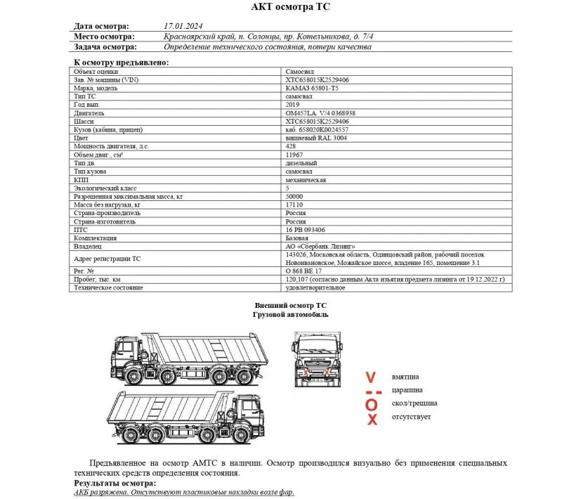 Самосвал Зав. № машины (VIN) XTC658015K2529406 Марка, модель КАМАЗ 65801-Т5 Тип ТС самосвал Год вып. 2019 Двигатель OM457LA. V/4 0368938 Шасси XTC658015K2529406 Кузов (кабина, прицеп) каб. 658020K0024557 Цвет вишневый RAL 3004 Мощность двигателя, л.с. 428 Объем двиг., см³ 11967 Тип дв. дизельный Тип кузова самосвал КПП механическая Экологический класс 5 Разрешенная максимальная масса, кг 50000 Масса без нагрузки, кг 17110 Страна-производитель Россия Страна-изготовитель Россия Пробег, тыс. км 120,107
