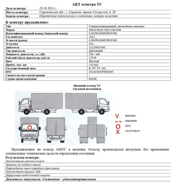 Специализированный, автомобиль-самосвал Зав. № машины (VIN) LZGJX4Z66NX039388 Марка, модель SHACMAN SX331863366 Тип ТС Грузовой Год вып. 2022 Двигатель 3122G025461 Шасси LZGJX4Z66NX039388 Кузов (кабина, прицеп) Отс. Цвет Желтый Мощность двигателя, л.с. 550 Объем двиг., см3 12540 Тип дв. Дизельный Тип кузова Грузовой КПП МКПП Экологический класс 5 Разрешенная максимальная масса, кг 41000 Масса без нагрузки, кг 19500 Грузоподъемность, кг. 21500 Страна-производитель Китай Страна-изготовитель Китай ПТС №164302059885865 Комплектация Базовая Пробег, тыс.км 152,062