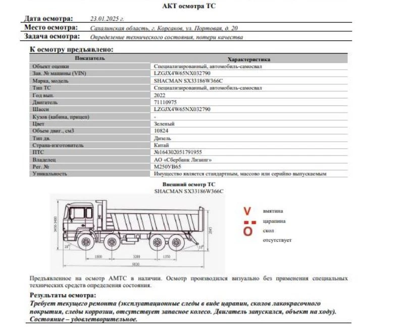 Специализированный, автомобиль-самосвал Зав. № машины (VIN) LZGJX4W65NX032790 Марка, модель SHACMAN SX33186W366C Тип ТС Грузовой Год вып. 2022 Двигатель 71110975 Шасси LZGJX4W65NX032790 Кузов (кабина, прицеп) - Цвет Зеленый Мощность, кВт 440 Объем двиг., см3 10824 Тип дв. Дизельный Тип кузова Спецтехника КПП МКПП Разрешенная максимальная масса, кг 41000 Масса без нагрузки, кг 19500 Грузоподъемность, т. 21500 Страна-производитель Китай Страна-изготовитель Китай Владелец АО «Сбербанк Лизинг»