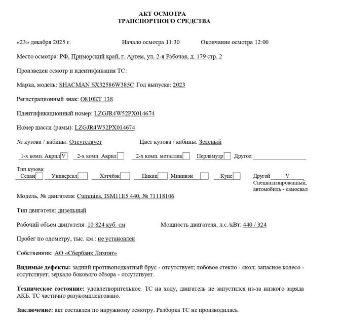 Специализированный, автомобиль - самосвал Марка, модель ТС SHACMAN SX32586W385C Идентификационный номер VIN LZGJR4W52PX014674 Категория ТС С Год выпуска ТС 2023 Модель / № двигателя Cummins, ISM11E5 440, № 71118106 Шасси № LZGJR4W52PX014674 Кузов (кабина) № Отсутствует Цвет кузова (кабины) Зеленый Мощность двигателя, л.с./кВт 440 / 324 Рабочий объем двигателя, куб.см 10 824 Тип двигателя Дизельный Экологический класс Пятый Разрешенная максимальная масса, кг 31 000 Масса без нагрузки, кг 17 000 Тип КПП МКПП Комплектация/ модификация Модификация SX32586W385C. Колесная формула/ведущие колеса: 6x6/все. Кабина Х3000 2-х местная с 1-м спальным местом Организация-изготовитель ТС Shaanxi Automobile Group Co., Ltd. Страна изготовителя КНР Собственник объекта Акционерное общество "Сбербанк Лизинг" (АО "Сбербанк Лизинг")