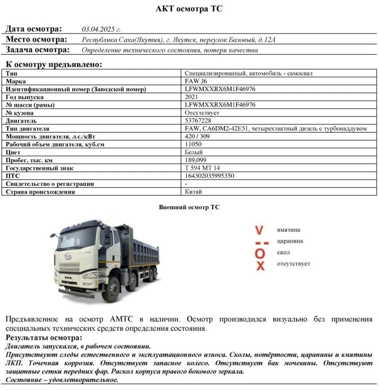 Специализированный, автомобиль - самосвал Зав. № машины (VIN) LFWMXXRX6M1F46976 Марка, модель FAW J6 Тип ТС Грузовой Год вып. 2021 Двигатель 53767228 Шасси LFWMXXRX6M1F46976 Кузов (кабина, прицеп) Отсутствует Цвет Белый Мощность двигателя, л.с. 420 Объем двиг., см3 11050 Тип дв. FAW, CA6DM2-42E51, четырехтактный дизель с турбонаддувом Тип кузова Самосвал КПП Механическая, с ручным управлением Экологический класс Пятый Разрешенная максимальная масса, кг 42600 Масса без нагрузки, кг 19660 Грузоподъемность, кг. 22940 Страна-производитель Китай Страна-изготовитель Китай Пробег, тыс.км. 189,099
