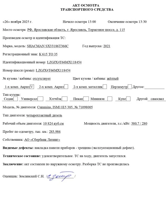 Специализированный, автомобиль - самосвал Марка, модель ТС SHACMAN SX33186T366C Идентификационный номер LZGJX4T66MX118454 Категория ТС Категория C Год выпуска ТС 2021 Модель / № двигателя Cummins, ISM11E5 385 / 71098005 Шасси № LZGJX4T66MX118454 Кузов (кабина) № Отсутствует Цвет кузова (кабины) Жёлтый Мощность двигателя, л.с./кВт 380,7 / 280 Рабочий объем двигателя, куб.см 10 824 Тип двигателя Четырехтактный дизель Экологический класс Пятый Разрешенная максимальная масса, кг 41 000 Масса без нагрузки, кг 19 500 Тип КПП Механическая, с ручным управлением Комплектация/ модификация Колесная формула 8x4, кабина X3000, 2-х местная, с 1-м спальным местом, двигатель Cummins, кузов с надставными бортами, МКПП (подробнее в приложении №1 к договору купли-продажи № ОВ/Ф-143040-04-01-С-01 от 08.11.2021 г.) Организация-изготовитель ТС Shaanxi Automobile Group Co., Ltd.