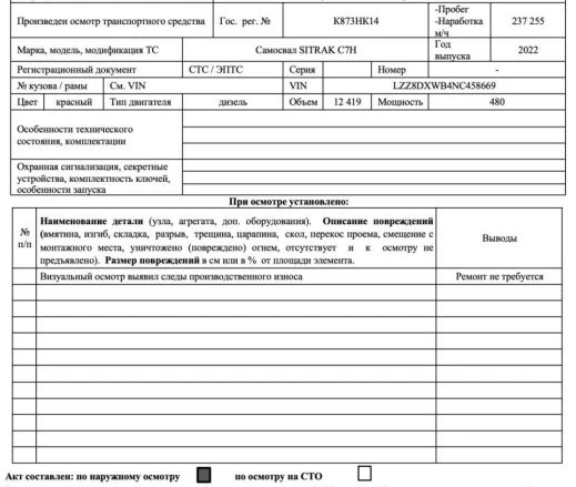 Самосвал SITRAK C7H Марка SITRAK Модель C7H Год выпуска 2022 Идентификационный номер (VIN) LZZ8DXWB4NC458669 Пробег, км 237 255 Местонахождение Хабаровский край, р-н Комсомольский, с. Хурба, ул. Гайдара, д. 17 Цвет кузова (кабина, прицеп) красный Мощность двигателя, л.с. (кВт) 480 Рабочий объем двигателя, куб. см. 12 419 Тип двигателя дизель Экологический класс пятый Разрешенная максимальная масса, кг 40 000 Изготовитель ТС (страна) ´China National Heavy Duty Truck Group Co., Ltd.ª