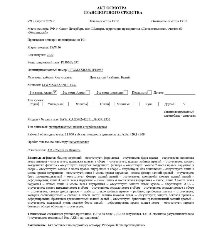 Специализированный автомобиль - самосвал Марка, модель ТС FAW J6 Идентификационный номер LFWMXXRX8N1F18937 Категория ТС категория C Год выпуска ТС 2022 Дата выпуска, согласно заводской табличке* 11.11.2022 Модель, № двигателя FAW, CA6DM2-42E51, четырехтактный дизель стурбонаддувом, № 53918352 Шасси № LFWMXXRX8N1F18937 Кузов (кабина) № Отсутствует Цвет кузова (кабины) Белый Мощность двигателя, л.с./кВт 420,1 / 309 Рабочий объем двигателя, куб.см 11 050 Тип двигателя Четырехтактный дизель с турбонаддувом Экологический класс Пятый Разрешенная максимальная масса, кг 42 600 Масса без нагрузки, кг 19 660 Тип КПП МКПП Комплектация/ модификация Модификация СА3310Р66К24Т4Е5. Кабина J6 2-местная с 1-м спальным местом. Колесная формула: 8х4/3-ой оси, 4-ой оси Организация-изготовитель ТС China FAW Group Co., Ltd. Страна изготовителя Китай Паспорт транспортного средства/Выписка из электронного паспорта транспортного средства № 164302054801270 от 26.12.2022 г.