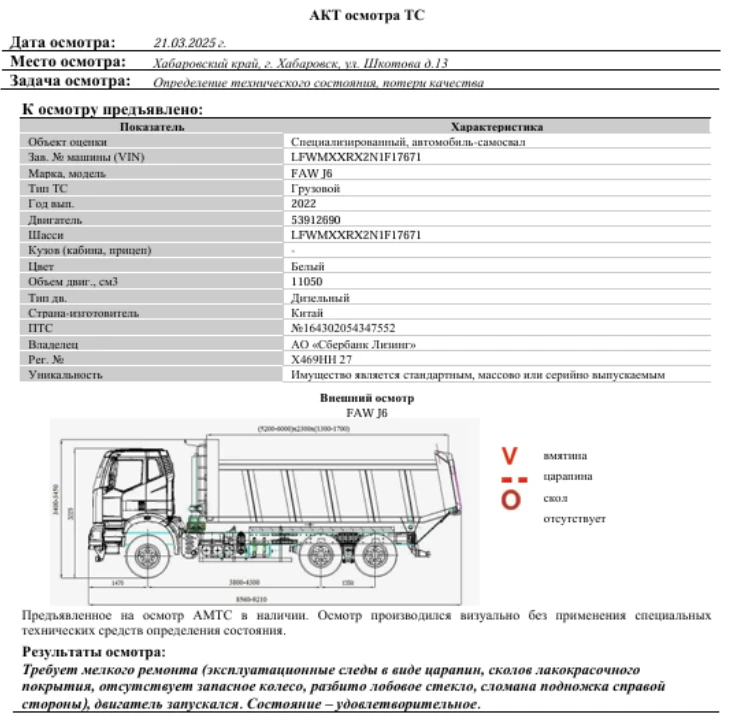 Специализированный, автомобиль-самосвал Зав. № машины (VIN) LFWMXXRX2N1F17671 Марка, модель FAW J6 Тип ТС Грузовой Год вып. 2022 Двигатель 53912690 Шасси LFWMXXRX2N1F17671 Кузов (кабина, прицеп) - Цвет Белый Мощность, л.с. 420 Объем двиг., см3 11050 Тип дв. Дизельный Тип кузова Грузовой КПП МКПП Разрешенная максимальная масса, кг 42600 Масса без нагрузки, кг 19660 Грузоподъемность, кг. 22940 Страна-производитель Китай Страна-изготовитель Китай Владелец АО «Сбербанк Лизинг»