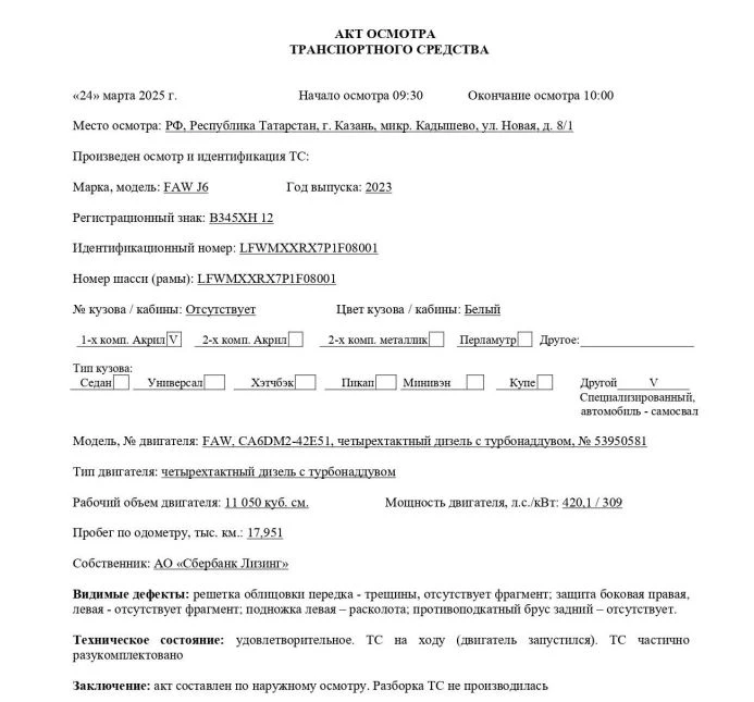 Специализированный, автомобиль-самосвал Марка, модель ТС FAW J6 Идентификационный номер LFWMXXRX7P1F08001 Категория ТС Категория C Год выпуска ТС 2023 Модель / № двигателя FAW, CA6DM2-42E51, четырехтактный дизель с турбонаддувом, № 53950581 Шасси № LFWMXXRX7P1F08001 Кузов (кабина) № Отсутствует Цвет кузова (кабины) Белый Мощность двигателя, л.с./кВт 420,1 / 309 Рабочий объем двигателя, куб.см 11 050 Тип двигателя Дизель Экологический класс Пятый Разрешенная максимальная масса, кг 42 600 Масса без нагрузки, кг 19 900 Тип КПП МКПП Комплектация/ модификация Модификация CA3310P66K24T4E5. Кабина 2-х местная с 1-м спальным местом. Колёсная формула 8x4/3-ой оси, 4-ой оси. Подробнее см. в Приложении №1 к Договору купли-продажи № ОВ/Ф-312783-01-01-С-01 от 29.06.2023 г. (копия в Приложении №2 Отчета) Организация-изготовитель ТС China FAW Group Co., Ltd. Страна изготовителя Китайская Народная Республика Паспорт транспортного средства/Выписка из электронного паспорта транспортного средства №164302061580635 от 04.05.2023 г.