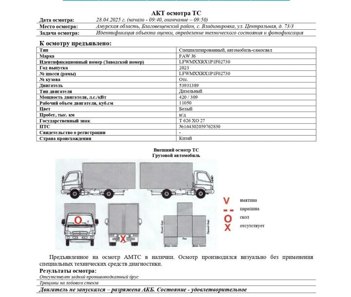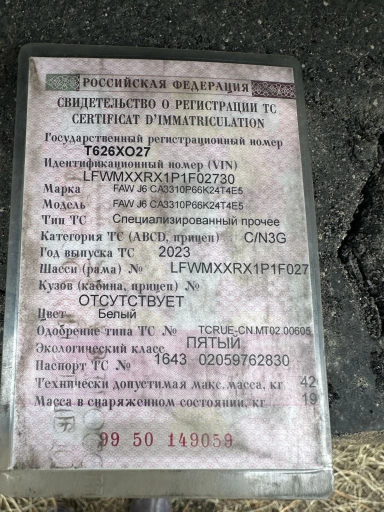 Специализированный, автомобиль-самосвал Зав. № машины (VIN) LFWMXXRX1P1F02730 Марка, модель FAW J6 Тип ТС Грузовой Год вып. 2023 Двигатель 53931389 Шасси LFWMXXRX1P1F02730 Кузов (кабина, прицеп) Отс. Цвет Белый Мощность двигателя, л.с. 420 Объем двиг., см3 11050 Тип дв. Дизельный Тип кузова Грузовой КПП Механическая Экологический класс 5 Разрешенная максимальная масса, кг 42600 Масса без нагрузки, кг 19900 Грузоподъемность, кг. 22700 Страна-производитель Китай Страна-изготовитель Китай