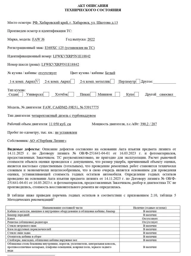 Специализированный, автомобиль - самосвал Марка, модель ТС FAW J6 Идентификационный номер LFWKVXRP5N1E18842 Категория ТС категория C Год выпуска ТС 2022 Модель, № двигателя FAW, CA6DM2-39E51, № 53917775 Шасси № LFWKVXRP5N1E18842 Кузов (кабина) № Отсутствует Цвет кузова (кабины) Белый Мощность двигателя, л.с./кВт 390,2 / 287 Рабочий объем двигателя, куб.см 11 050 Тип двигателя Четырехтактный дизель с турбонаддувом Экологический класс Пятый Технически допустимая максимальная масса транспортного средства (кг) 35 100 Масса транспортного средства в снаря- 15 760 Характеристика Значения женном состоянии (кг) Тип КПП МКПП Комплектация/ модификация Модификация - CA3250P66K24T1E5. Колесная формула/ведущие колеса: 6x4/2-ой оси, 3-ой оси. Кабина 2-х местная, с 1-м спальным местом Организация-изготовитель ТС China FAW Group Co., Ltd. Страна изготовителя Китайская Народная Республика Собственник объекта Акционерное общество "Сбербанк Лизинг" (АО "Сбербанк Лизинг")