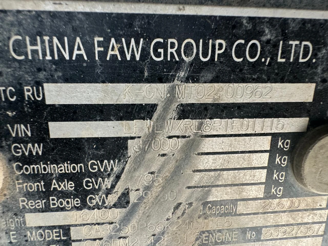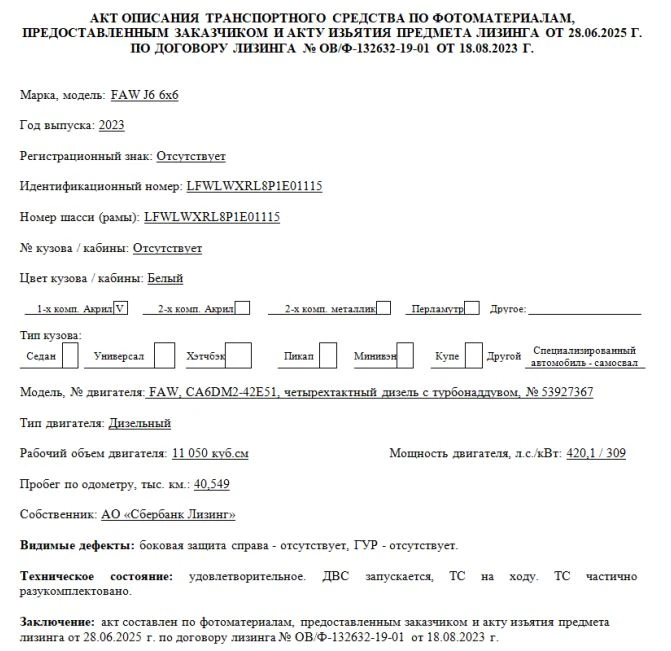 Специализированный, автомобиль - самосвал Марка, модель ТС FAW J6 6х6 Идентификационный номер LFWLWXRL8P1E01115 Категория ТС категория C Год выпуска ТС 2023 Модель, № двигателя FAW, CA6DM2-42E51, четырехтактный дизель с турбонаддувом, № 53927367 Номер шасси (рамы) LFWLWXRL8P1E01115 Номер кузова (кабины, прицепа) Отсутствует Цвет кузова (кабины, прицепа) Белый Мощность двигателя, л.с./кВт 420,1 / 309 Рабочий объем двигателя, куб.см 11 050 Вид топлива Дизельное Экологический класс Пятый Технически допустимая максимальная масса транспортного средства (кг) 37 000 Масса транспортного средства в снаряженном состоянии (кг) 16 400 Тип КПП МКПП Комплектация/ модификация Модификация - CA3250P66K24L1TE5. Кабина 2-х местная, с 1-м спальным местом. Колесная формула/ведущие колеса: 6x6/все, объем кузова 20 м3. Организация-изготовитель ТС China FAW Group Co., Ltd. Страна изготовителя Китайская Народная Республика Собственник объекта Акционерное общество "Сбербанк Лизинг" (АО "Сбербанк Лизинг")