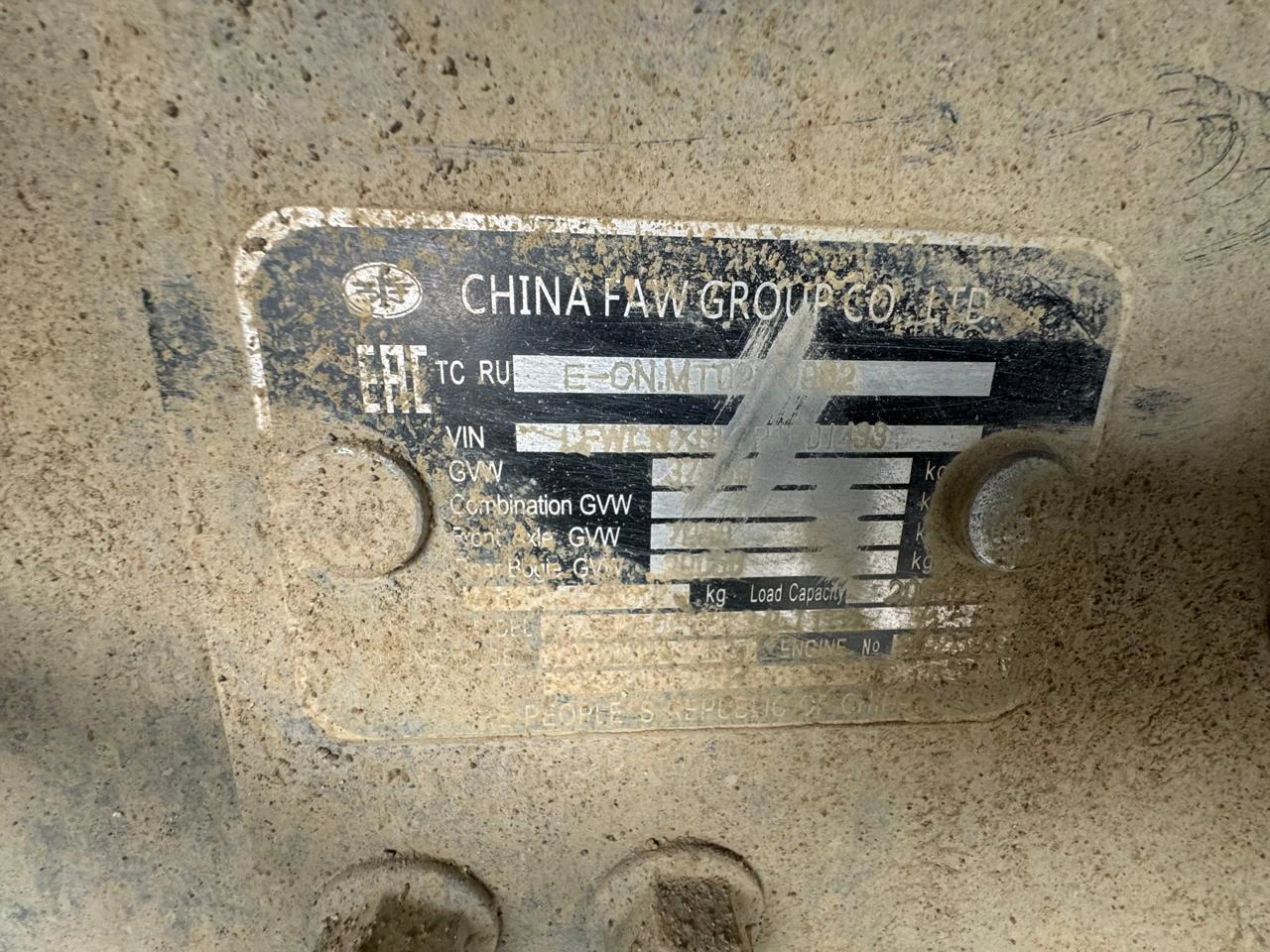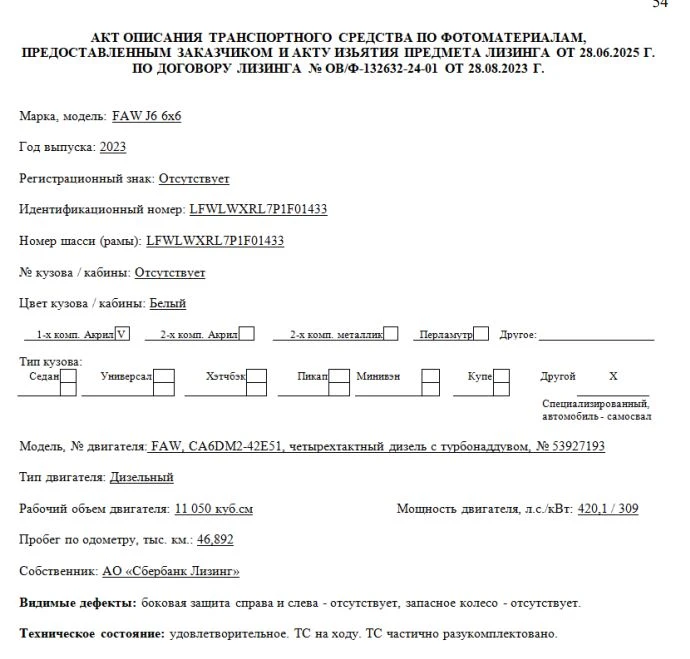 Специализированный, автомобиль - самосвал Марка, модель ТС FAW J6 6х6 Идентификационный номер LFWLWXRL7P1F01433 Категория ТС категория C Год выпуска ТС 2023 Модель, № двигателя FAW, CA6DM2-42E51, четырехтактный дизель с турбонаддувом, № 53927193 Номер шасси (рамы) LFWLWXRL7P1F01433 Номер кузова (кабины, прицепа) Отсутствует Цвет кузова (кабины, прицепа) Белый Мощность двигателя, л.с./кВт 420,1 / 309 Рабочий объем двигателя, куб.см 11 050 Вид топлива Дизельное Экологический класс Пятый Технически допустимая максимальная масса транспортного средства (кг) 37 000 Масса транспортного средства в снаряженном состоянии (кг) 16 400 Тип КПП МКПП Комплектация/ модификация Модификация - CA3250P66K24L1TE5. Кабина 2-х местная, с 1-м спальным местом. Колесная формула/ведущие колеса: 6x6/все, объем кузова 20 м3. Организация-изготовитель ТС China FAW Group Co., Ltd. Страна изготовителя Китайская Народная Республика Собственник объекта Акционерное общество "Сбербанк Лизинг" (АО "Сбербанк Лизинг")