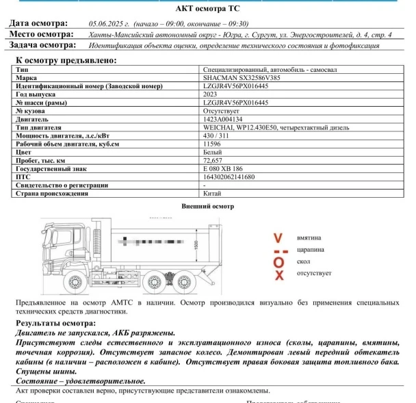 Cпециализированный, автомобиль - самосвал Зав. № машины (VIN) LZGJR4V56PX016445 Марка, модель SHACMAN SX32586V385 Тип ТС Грузовой Год вып. 2023 Двигатель 1423A004134 Шасси LZGJR4V56PX016445 Кузов (кабина, прицеп) Отсутствует Цвет Белый Мощность двигателя, л.с. 430 Объем двиг., см3 11596 Тип дв. WEICHAI, WP12.430E50, четырехтактный дизель Тип кузова Самосвал КПП Механическая, с ручным управлением Экологический класс Пятый Разрешенная максимальная масса, кг 31000 Масса без нагрузки, кг 17000 Грузоподъемность, кг. 14 000 Страна-производитель Китай Страна-изготовитель Китай ПТС / ЭПТС 164302062141680