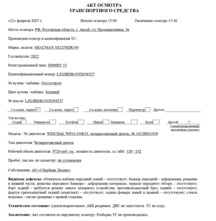 Наименование (тип ТС) Специализированный, автомобиль - самосвал Марка, модель ТС SHACMAN SX3258DR384 Идентификационный номер LZGJRDR41NX056527 Категория ТС категория С Год выпуска ТС 2022 Модель, № двигателя WEICHAI, WP10.336E53, четырехтактный дизель, № 1622H031959 Шасси № LZGJRDR41NX056527 Кузов (кабина) № Отсутствует Цвет кузова (кабины) Зеленый Мощность двигателя, л.с./кВт 329 / 242 Рабочий объем двигателя, куб.см. 9 726 Тип двигателя Четырехтактный дизель Экологический класс Пятый Технически допустимая максимальная масса транспортного средства, (кг) 31 000 Масса транспортного средства в снаряженном состоянии, (кг) 16 455 Тип КПП МКПП Модификация/комплектация Модификация- SX3258DR384. Кабина F3000 D'long 2-х местная с 1-м спальным местом. Колесная формула/ведущие колеса: 6x4/2-ой оси, 3-ой оси Организация-изготовитель ТС Shaanxi Automobile Group Co., Ltd. Страна изготовителя Китайская Народная Республика