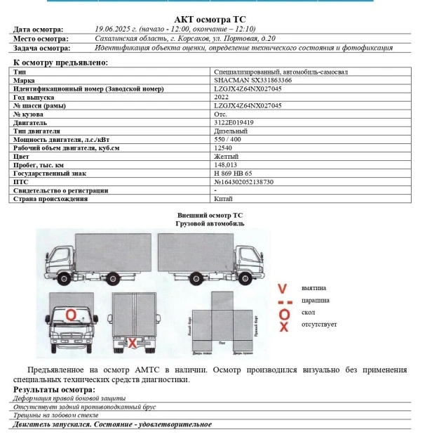 Специализированный, автомобиль-самосвал Зав. № машины (VIN) LZGJX4Z64NX027045 Марка, модель SHACMAN SX331863366 Тип ТС Грузовой Год вып. 2022 Двигатель 3122E019419 Шасси LZGJX4Z64NX027045 Кузов (кабина, прицеп) Отс. Цвет Желтый Мощность двигателя, л.с. 550 Объем двиг., см3 12540 Тип дв. Дизельный Тип кузова Грузовой КПП Механическая Экологический класс 5 Разрешенная максимальная масса, кг 41000 Масса без нагрузки, кг 19500 Грузоподъемность, кг. 21500 Страна-производитель Китай Страна-изготовитель Китай Пробег, тыс.км 148,013