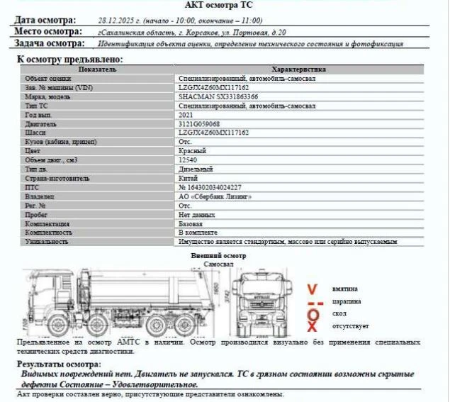 Специализированный, автомобиль-самосвал Зав. № машины (VIN) LZGJX4Z60MX117162 Марка, модель SHACMAN SX331863366 Тип ТС Грузовой Год вып. 2021 Двигатель 3121G059068 Шасси LZGJX4Z60MX117162 Кузов (кабина, прицеп) Отс. Цвет Красный Мощность двигателя, л.с. 550 Объем двиг., см3 12540 Тип дв. Дизельный Тип кузова Грузовой КПП Механическая Экологический класс 5 Разрешенная максимальная масса, кг 41000 Масса без нагрузки, кг 19500 Грузоподъемность, кг. 21500 Страна-производитель Китай Страна-изготовитель Китай Владелец АО «Сбербанк Лизинг»
