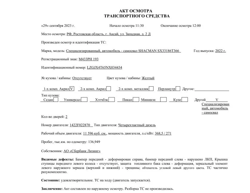 Наименование (тип ТС) Специализированный, автомобиль - самосвал Марка, модель ТС SHACMAN SX33186T366 Идентификационный номер LZGJX4T65NX034434 Категория ТС Категория C Год выпуска ТС 2022 Модель / № двигателя WEICHAI, WP12.375E50 / 1422F022870 Шасси № LZGJX4T65NX034434 Кузов (кабина) № Отсутствует Цвет кузова (кабины) Желтый Мощность двигателя, л.с./кВт 368,5 / 271 Рабочий объем двигателя, куб.см 11 596 Тип двигателя Четырехтактный дизель Экологический класс Пятый Разрешенная максимальная масса, кг 41 000 Масса без нагрузки, кг 19 500 Тип КПП Механическая, с ручным управлением Комплектация/ модификация Модификация SX33186T366. Колёсная формула 8х4, кабина 2-х местная с 1-м спальным местом, объем кузова - 35,0 куб. м Пробег, тыс.км. 136,949