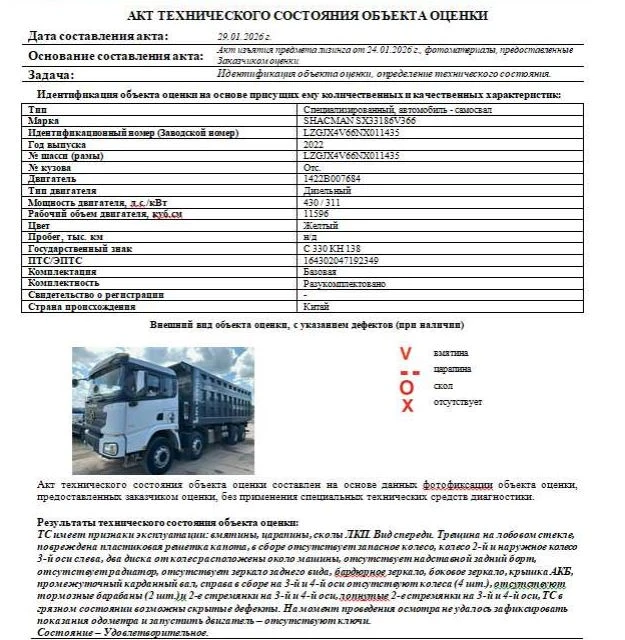 Специализированный, автомобиль - самосвал Зав. № машины (VIN) LZGJX4V66NX011435 Марка, модель SHACMAN SX33186V366 Тип ТС Грузовой Год вып. 2022 Двигатель 1422B007684 Шасси LZGJX4V66NX011435 Кузов (кабина, прицеп) Отс. Цвет Желтый Мощность двигателя, л.с. 430 Объем двиг., см3 11596 Тип дв. Дизельный Тип кузова Грузовой КПП Механическая Экологический клаасс 5 Разрешенная максимальная масса, кг 41000 Масса без нагрузки, кг 19500 Грузоподъемность, т. 21 500 Страна-производитель Китай Страна-изготовитель Китай Комплектация Базовая Владелец АО «Сбербанк Лизинг»