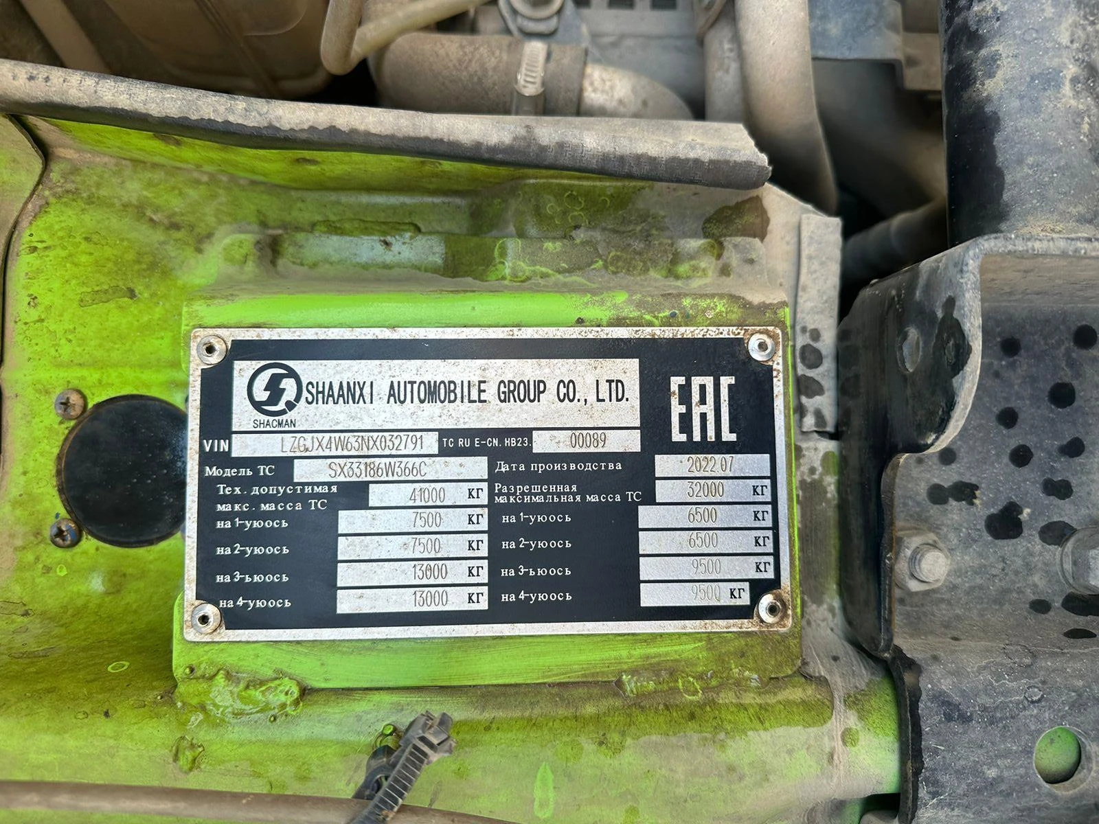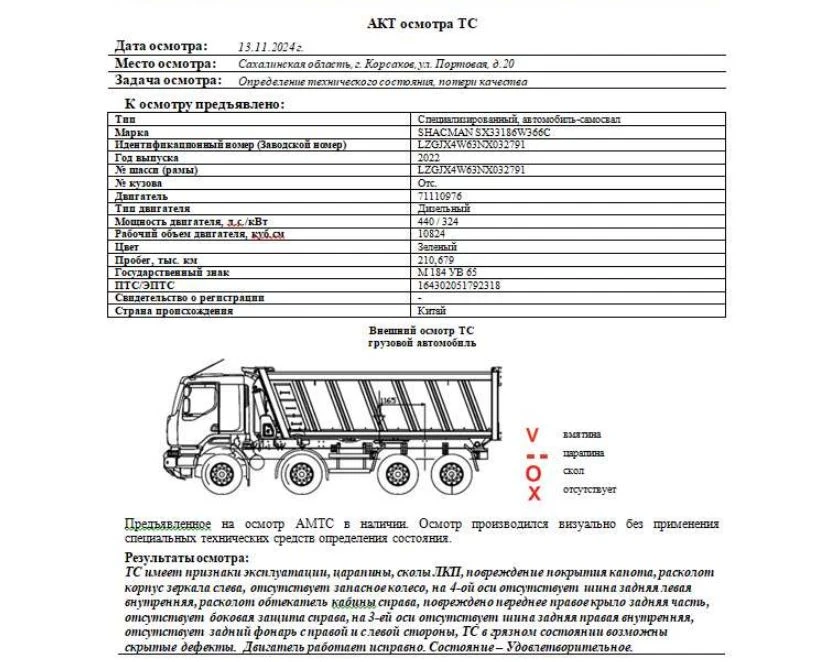 Специализированный, автомобиль-самосвал Зав. № машины (VIN) LZGJX4W63NX032791 Марка, модель SHACMAN SX33186W366C Тип ТС Грузовой Год вып. 2022 Двигатель 71110976 Шасси LZGJX4W63NX032791 Кузов (кабина, прицеп) Отс. Цвет Зеленый Мощность двигателя, л.с. 440 Объем двиг., см3 10824 Тип дв. Дизельный Тип кузова Грузовой КПП Механическая Экологический клаасс 5 Разрешенная максимальная масса, кг 41000 Масса без нагрузки, кг 19500 Грузоподъемность, т. 21 500 Страна-производитель Китай Страна-изготовитель Китай Владелец АО «Сбербанк Лизинг»