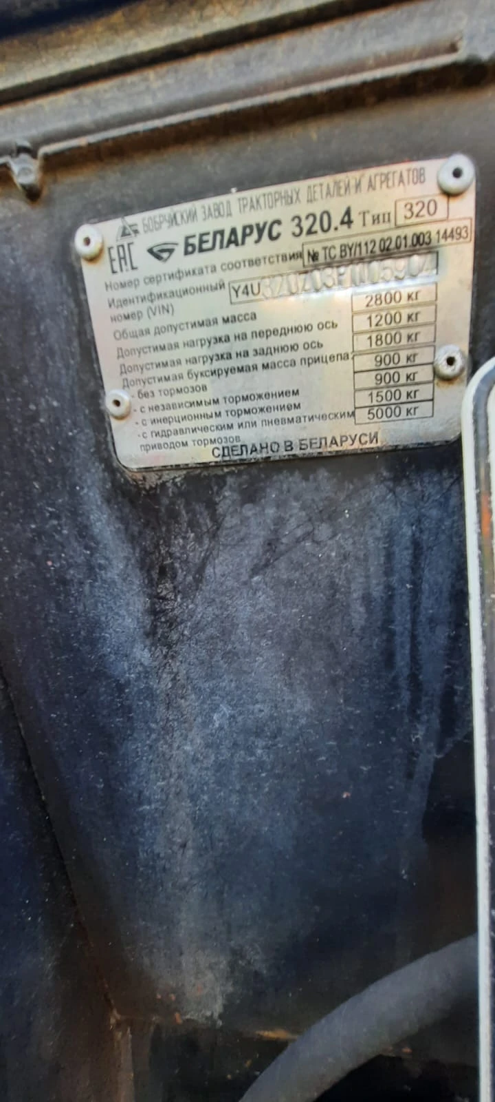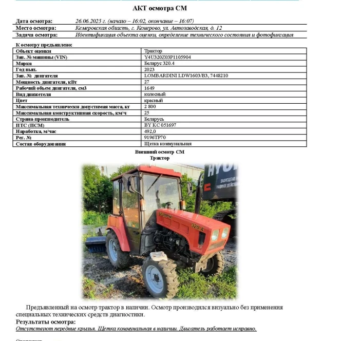 Объект оценки Трактор Зав. № машины (VIN) Y4U320Z03P1105904 Марка Беларус 320.4 Год вып. 2023 Зав. № двигателя LOMBARDINI LDW1603/B3, 7448210 Мощность двигателя, кВт 27 Рабочий объем двигателя, см3 1649 Вид движетеля колесный Цвет красный Максимальная технически допустимая масса, кг 2 800 Максимальная конструктивная скорость, км/ч 25 Страна-производитель Беларусь ПТС (ПСМ) BY KC 051697 Наработка, м/час 492,0 Рег. № 9196ТР70 Состав оборудования Щетка коммунальная (в наличии)