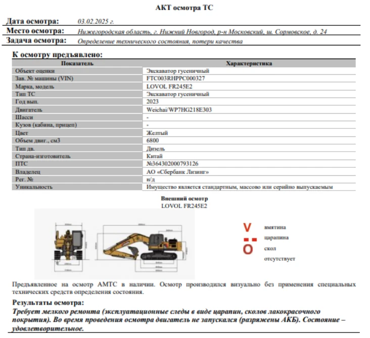Объект оценки Экскаватор гусеничный Зав. № машины (VIN) FTC003RHPPC000327 Марка, модель LOVOL FR245E2 Тип ТС Спецтехника Год вып. 2023 Двигатель Weichai/WP7HG218E303 Шасси - Кузов (кабина, прицеп) FTC003RHPPC000327 Цвет Желтый Мощность, кВт 218 Объем двиг., см3 6800 Тип дв. Дизельный Тип кузова Спецтехника Экологический клаасс - Разрешенная максимальная масса, кг 23500 Масса без нагрузки, кг Объем ковша, куб.м. 1,2 Страна-производитель Китай Страна-изготовитель Китай