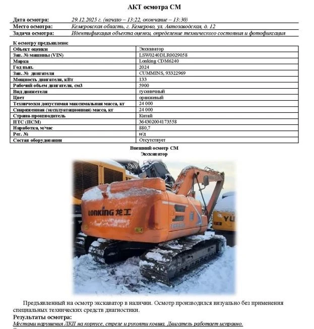 Экскаватор Зав. № машины (VIN) LSW0240DLR0029058 Марка Lonking CDM6240 Год вып. 2024 Зав. № двигателя CUMMINS, 93322969 Мощность двигателя, кВт 133 Рабочий объем двигателя, см3 5900 Вид движетеля гусеничный Цвет оранжевый Технически допустимая максимальная масса, кг 24 000 Снаряженная (эксплуатационная) масса, кг 24 000 Страна-производитель Китай ПТС (ПСМ) 364302004173558 Наработка, м/час 880,7