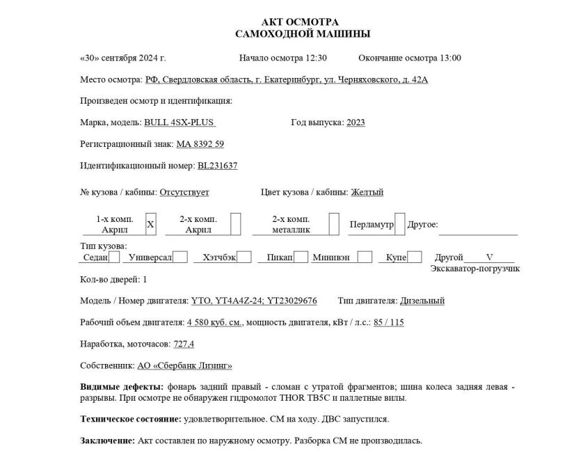 Экскаватор-погрузчик BULL 4SX-PLUS Марка, коммерческое наименование СМ BULL 4SX-PLUS Идентификационный номер BL231637 Год выпуска СМ 2023 Дата выпуска СМ, согласно заводской табличке 01.08.2023 * Модель; № двигателя YTO, YT4A4Z-24; YT23029676 Цвет кузова (кабины, прицепа) Желтый Мощность двигателя (кВт/л.с.) 85 / 115 Рабочий объем двигателя, куб.см. 4 580 Тип двигателя Дизельный Вид движителя Колесный Технически допустимая максимальная масса, кг 13 000 Снаряженная (эксплуатационная) масса, кг 10 500 Комплектация / модификация Паспорт самоходной машины/Выписка из электронного паспорта самоходной машины № 364302001891883 от 11.09.2023 г.