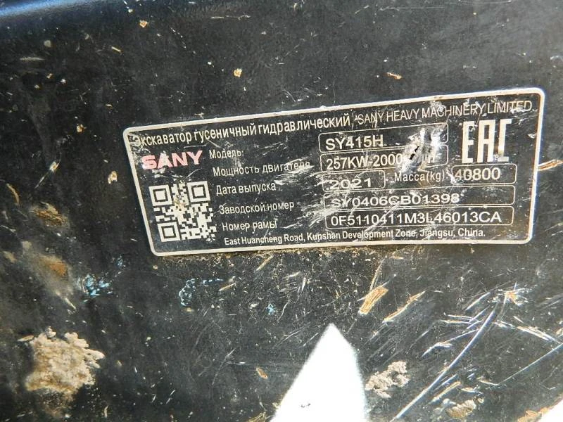 Экскаватор Марка SANY SY415H Зав. № машины (VIN) SY0406CB01398/0F5110411M3L46013CA Год вып. 2021 Цвет комбинированный: желтый, черный Вид движителя гусеничный Разрешенная максимальная масса, кг 40 800 Максимальная конструктивная скорость, км/ч 5 Мощность двигателя, л.с. 350 Рабочий объем двигателя, см³ 9893 Модель, номер двигателя 6UZ1-XDHAG-02C3, 6UZ1-539814 Страна-производитель Китай Страна-изготовитель Китай Комплектность В комплекте