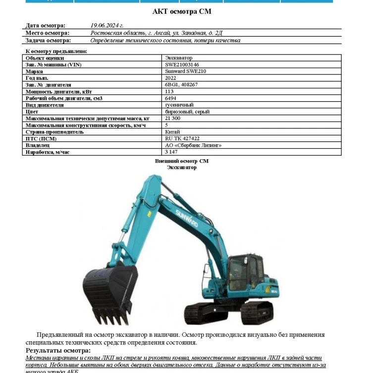 Объект оценки Экскаватор Зав. № машины (VIN) SWE21003146 Марка Sunward SWE210 Год вып. 2022 Зав. № двигателя 6BG1, 408267 Мощность двигателя, кВт 113 Рабочий объем двигателя, см3 6494 Вид движетеля гусеничный Цвет бирюзовый, серый Максимальная технически допустимая масса, кг 21 300 Максимальная конструктивная скорость, км/ч 5 Страна-производитель Китай ПТС (ПСМ) RU TK 427422 Владелец АО «Сбербанк Лизинг» Наработка, м/час 3 146,6*