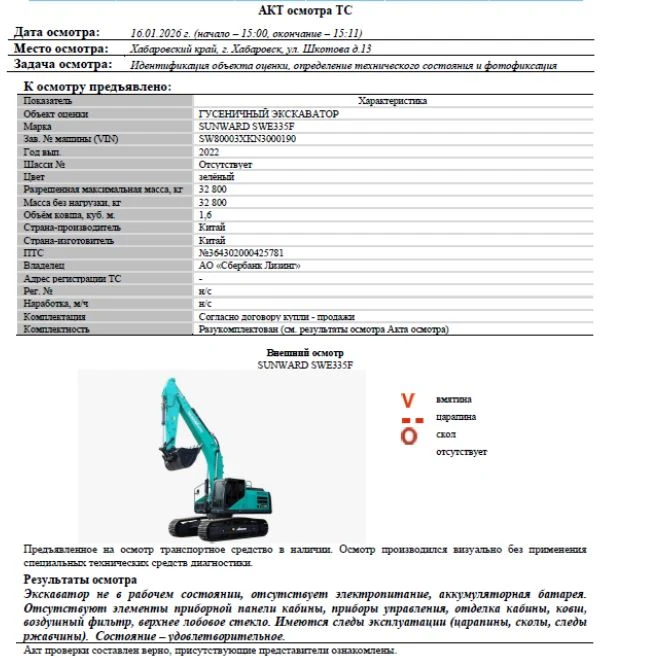 ГУСЕНИЧНЫЙ ЭКСКАВАТОР Марка SUNWARD SWE335F Зав. № машины (VIN) SW80003XKN3000190 Год вып. 2022 Шасси № Отсутствует Цвет зелёный Разрешенная максимальная масса, кг 32 800 Масса без нагрузки, кг 32 800 Объём ковша, куб. м. 1,6 Страна-производитель Китай Страна-изготовитель Китай ПТС №364302000425781 Владелец АО «Сбербанк Лизинг» Адрес регистрации ТС - Рег. № н/с Наработка, м/ч н/с