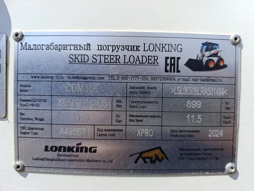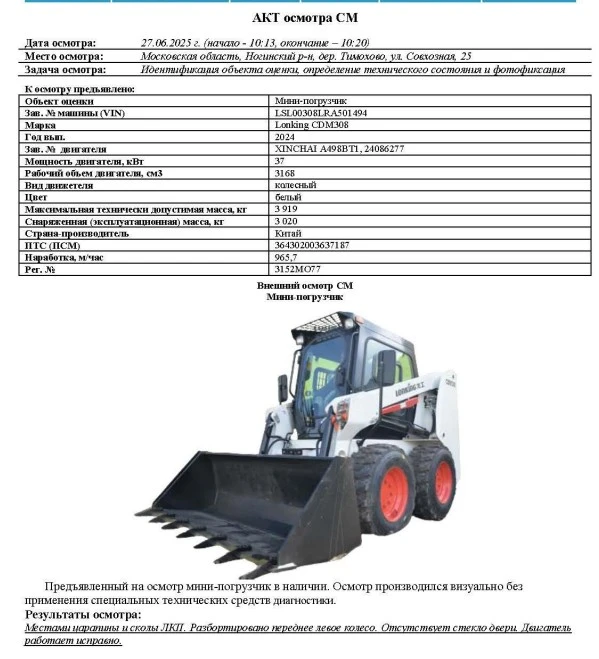 Объект оценки Мини-погрузчик Зав. № машины (VIN) LSL00308LRA501494 Марка Lonking CDM308 Год вып. 2024 Зав. № двигателя XINCHAI A498BT1, 24086277 Мощность двигателя, кВт 37 Рабочий объем двигателя, см3 3168 Вид движетеля колесный Цвет белый Максимальная технически допустимая масса, кг 3 919 Cнаряженная (эксплуатационная) масса, кг 3 020 Страна-производитель Китай ПТС (ПСМ) 364302003637187 Наработка, м/час 965,7